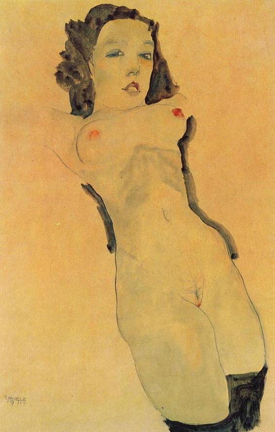 Egon Schiele- Nackt, kniend mit schwarzem Strumpf [Nude, Kneeling with Black Stocking ] ,1911