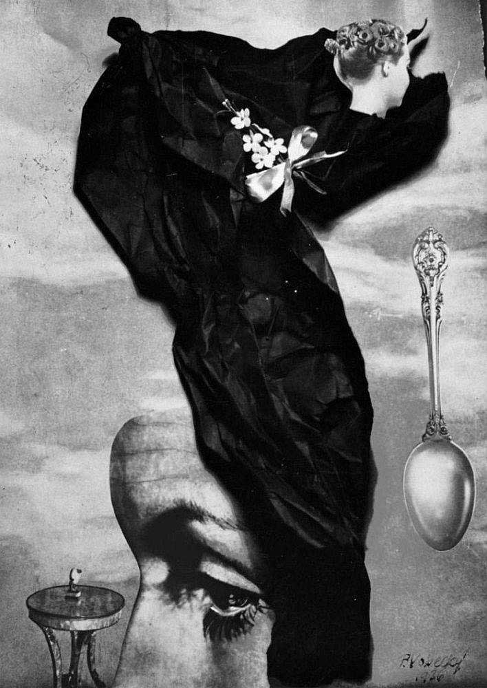 « A strong wave of Surrealism hit Czechoslovakia in the 1930’s, and Frantisek Vobecky (1902-1991), a painter who used photography to document his images, got caught up in it. He began to explore photomontage in 1935. His early assemblages were of items with logical connections, like the pins, cloth and string in »Composition » (1935). But logic was soon supplanted by fantasy. Light, shadows (particularly those cast by items outside of the picture) and disparate objects were juxtaposed in dreamy arrangements that often had an erotic component.