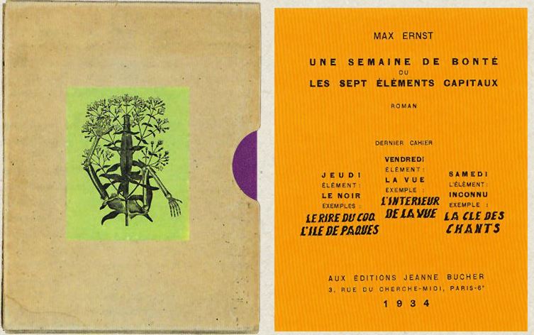 Max Ernst « avait à l’origine prévu de le publier en sept cahiers afin d’associer à chaque cahier un jour de la semaine. Le choix du titre renvoie d’ailleurs au sept jours de la Genèse. Mais c’est également une allusion à l’association d’entraide « La semaine de la bonté » fondée en 1927 pour promouvoir l’action sociale. Paris avait été envahi d’affiches de l’organisation sollicitant le concours de chacun. Le titre, comme les éléments constitutifs des collages sont autant d' »emprunts » de Max Ernst. »@Musée d’Orsay