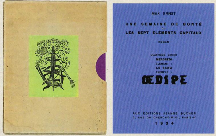 Pour quoi faire ? Pour confectionner son troisième ensemble de collages. Une Semaine de Bonté ( le troisième roman-collage de Max Ernst, apres « La Femme 100 têtes » de 1929 et « Rêve d’une petite fille qui voulut entrer au Carmel » de1930. Ces planches furent éditées par Jeanne Bucher l’année suivante en 1934 donc, en un coffret de cinq cahiers, à 800 exemplaires, comportant 184 Collages ( que je vous présente , mais que je ne possède pas (malheureusement), mais il existe aujourd’hui deux très bons livres Ici qui vous présentent toutes les Oeuvres de ce romans collage, que vous pouvez acquérir pour quelques euros, (optez pour celui de Werner Spies qui respecte les originaux, (teintes par exemple…etc) mais qui est plus cher. L’autre vous trouvez ttes les copies sur le net)