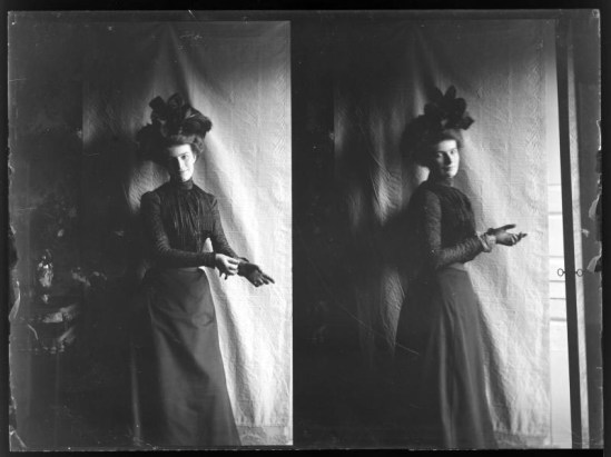 Ferdinand Schmutzer-Lady with hat puts on gloves. Almost whole figure. Two self-contained representations on a plate..1900-1910
