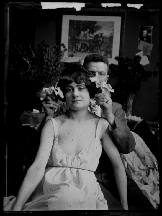 Ferdinand Schmutzer-Woman in light dress, behind him man holding her orchids to the hair in atelier scene.,1903