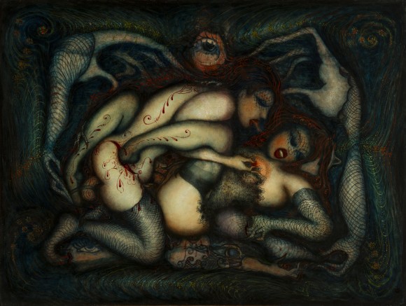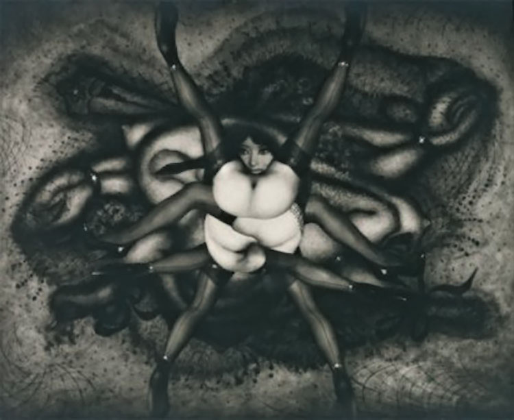 Mais les 10 années d’amitié avec André Breton qui décrit sa peinture comme » magique » achoppent sur le titre d’un tableau blasphématoire : « Oh !…Marie, Mère de Dieu », réalisé en 1965 (où deux femmes pratiquent une fellation et une sodomie sur un Christ crucifié). En effet ce tableau parvient même à dissuader André Breton de l’intégrer à l’Exposition Internationale du Surréalisme.