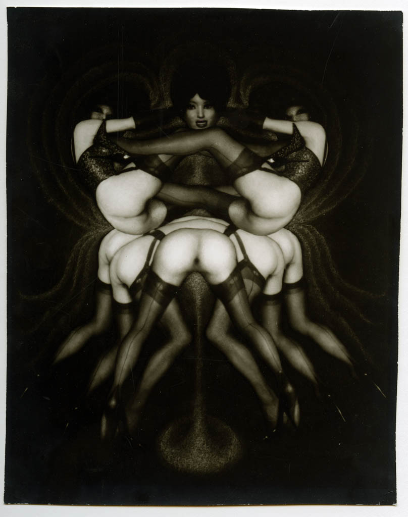 Le Chaman et ses créatures est articulé autour de deux figures tutélaires, Emmanuelle et Hanel Koeck, dont l’évolution des relations sentimentales influe sur la distribution des images, leur rythme et leur ordre. Il se documente et exploite abondamment le livre de Mircea Eliade sur le chamanisme : « Le chamanisme est une des techniques archaïques de l’extase, à la fois mystique, magie et “religion” dans le sens large du terme » (préface, Payot, 1950). Les répétitions de bras et de jambes ainsi que la symétrie qui caractérisent les photomontages trouvent leur source autant dans les représentations de Shiva ou dans le tantrisme1 que dans une publicité de machine à laver découpée et conservée par Molinier. Sur le pavois, la planche 26 du Chaman, est citée par l’écrivaine, journaliste et éditrice féministe Xavière Gaut hier dans son étude Surréalisme et sexualité (Gallimard, 1971) qui dresse un bilan sévère du rapport des surréalistes au corps et à l’amour.