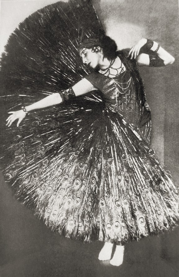 Franz Löwy, Sent M’Ahesa (Elsa von Carlberg) in peacock costume , c 1928 from The artistic dance of our time by H. and M Aubel. Leipzig K. R. Langewiesche, 1928th.
