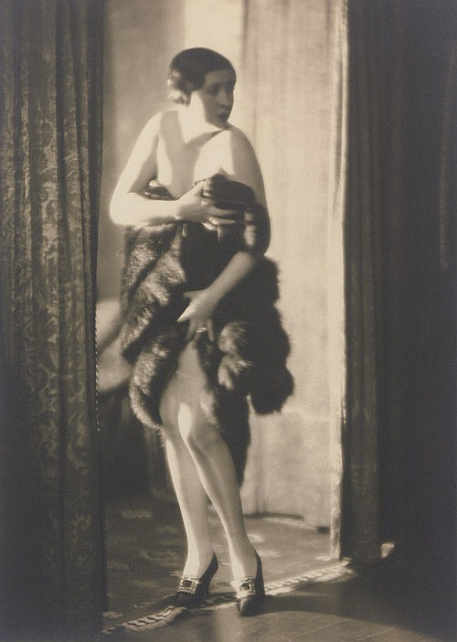 Mario von Bucovich- Female nude in shoes holding a fur stole. 1927. Vintage toned matte gelatin silver print
