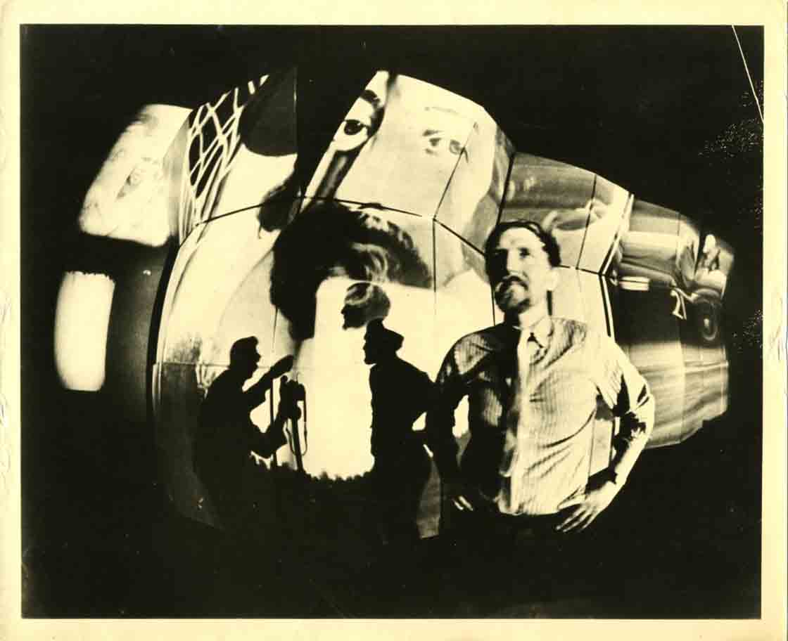 Stan VanDerBeek in front of Movie Mural. Installation view, Institute of Contemporary Art, Boston,  1968