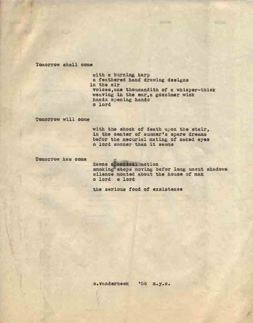 « VanDerBeek studied art and architecture first at Cooper Union College in New York and then at Black Mountain College in North Carolina, where he met architect Buckminster Fuller, composer John Cage, and choreographer Merce Cunningham. VanDerBeek began his career in the 1950s making independent art film while learning animation techniques and working painting scenery and set designs for the American TV show, Winky Dink and You. His earliest films, made between 1955 and 1965 mostly consist of animated paintings and collage films, combined in a form of organic development.