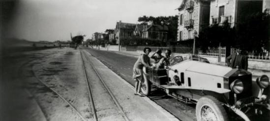 Jacques-Henri Lartigue, Bibi et une amie Nana sur la plage, Hendaye, Août 1927 dans l’automobile Amilcar de lartigues